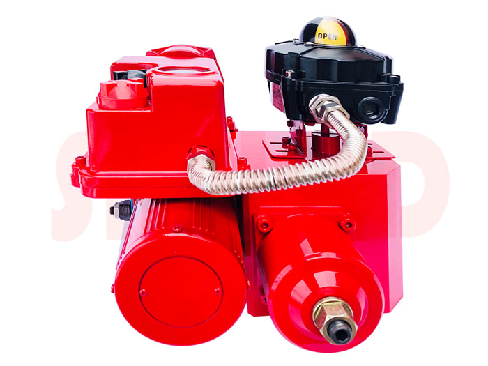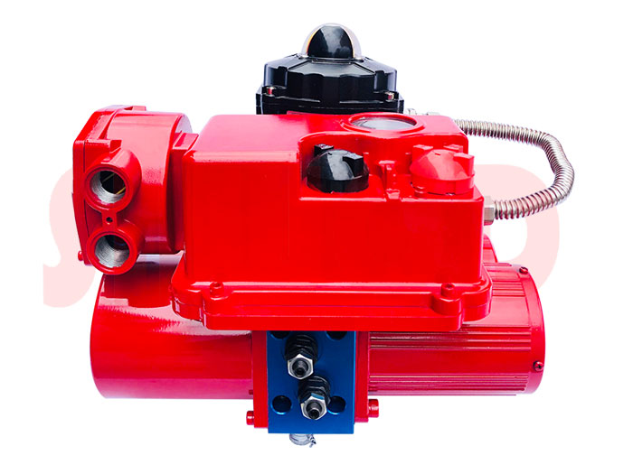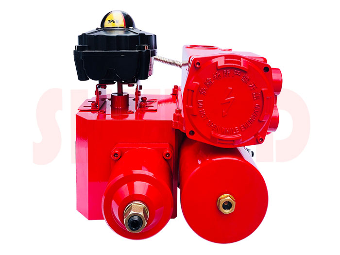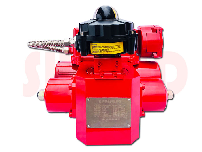 電液執行器由支架,雙作用齒輪齒條執行器、液壓動力源和電氣控製係統組成。 其中液壓動力源包含電機泵組以及手動泵。