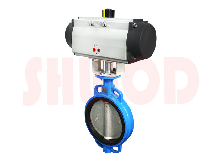 氣動對夾蝶閥是以壓縮空氣0.4-0.7MPa的氣源為動力,驅動閥杆帶動帶碟板在閥體內做0-90度的旋轉,達到對蝶閥全開和全關的操作控製。氣動對夾蝶閥可根據工況要求,對執行器裝配閥門定位器,輸入4-20mA的相關信號,從而控製蝶閥碟板的開度大小,實現對管道中介質的壓力、流量、溫度、液位等參數的百分比精準調節。氣動對夾蝶閥不僅可用於工業自動控製係統中作就地控製,也可進行遠距離集中控製,是工業管道中應用優先選用的係統裝置之一。