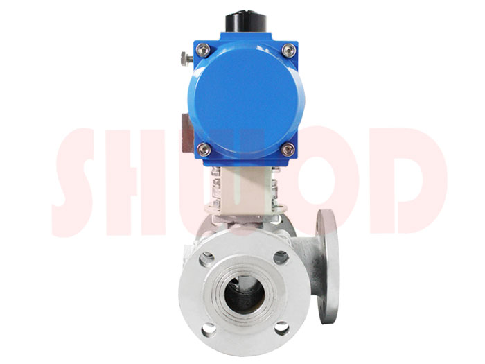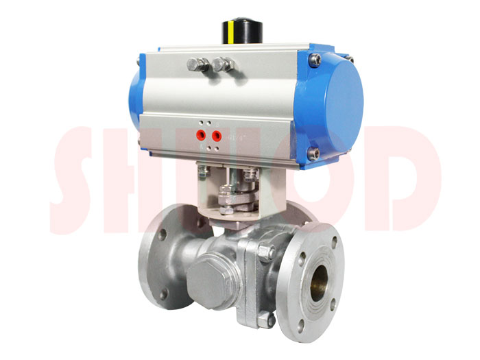 氣動三通球閥是用於管道中介質換向、合流及分流的作用,主要由T型或L型三通球閥與氣動執行器連接組成,按連接方式不同可分為法蘭及內螺紋。氣動三通球閥是對兩條相互垂直的通道進行介質流向的切換或截斷,起到分配作用,而T型球閥不僅可對介質流向進行切換,還可以使三個通道互相連通或關閉其中任意一條通道,起到分流、合流作用。可根據工況需要,在氣動三通球閥執行器上加裝閥門定位器及其它相關配件,即可控製氣動球閥球芯的運轉,達到對管路中介質的自動化控製。